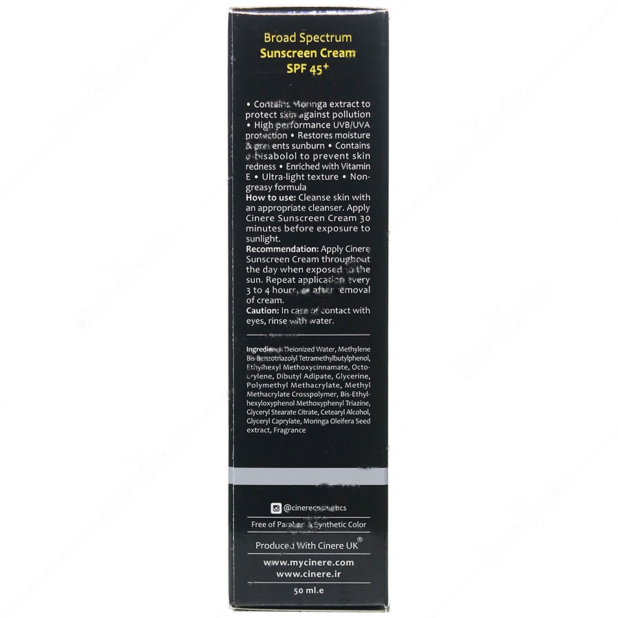 این محصول حاوی فیلترهای شیمیایی و فیزیکی است که به جذب و مسدود کردن پرتوهای مضر خورشید کمک میکنند. همچنین دارای عصاره دانه مورینگا است که پوست را در برابر آلودگیهای محیطی محافظت میکند و به کاهش قرمزی و التهاب ناشی از تابش آفتاب کمک میکند. این کرم برای استفاده روزانه طراحی شده و مقاوم در برابر تعریق و شستشو است.