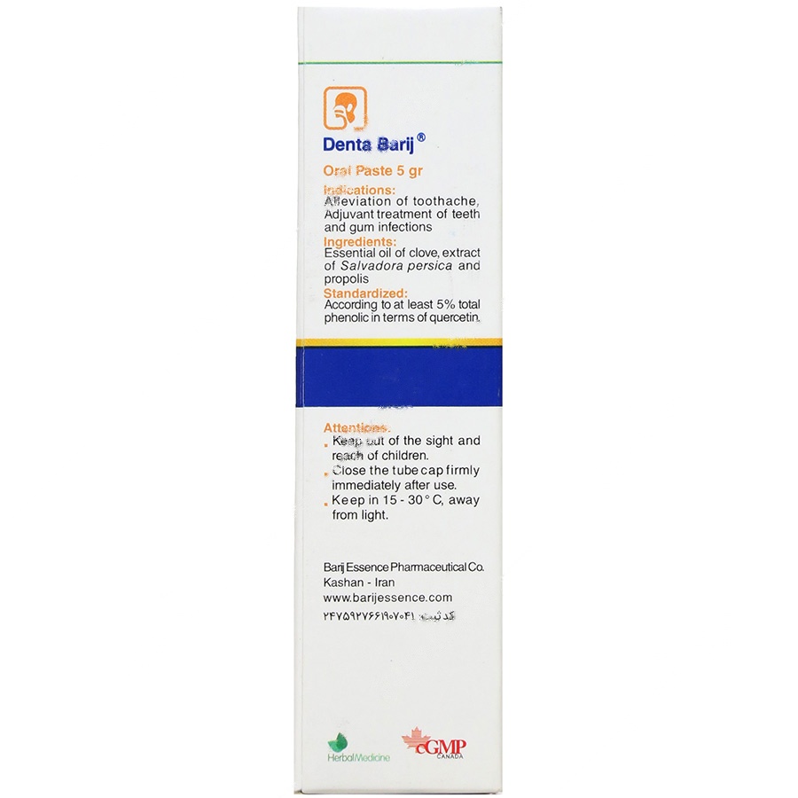 خمیر دنتا باریج حاوی اسانس میخک هندی، عصاره چوب مسواک و بره موم است. این ترکیبات به دلیل خواص ضدباکتریایی و تسکینی خود، به عنوان گزینهای طبیعی و مؤثر در درمان درد دندان و عفونتهای لثه شناخته میشوند. اوژنول موجود در میخک به عنوان مسکن و ضدعفونیکننده عمل میکند، در حالی که چوب مسواک به تقویت دندانها و جلوگیری از پوسیدگی کمک میکند.