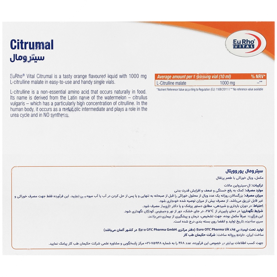 سیترومال، یک مکمل غذایی حاوی 1000 میلی گرم ال سیترولین مالات در هر ویال است که به ویژه برای ورزشکاران طراحی شده است. این محصول به کاهش احساس خستگی و افزایش قدرت بدنی کمک میکند. سیترومال تحت لیسانس کارخانه Euro OTC Pharma GmbH آلمان تولید و توسط شرکت حکیمان طب کار در ایران عرضه میشود. این مکمل خوراکی به صورت ویالهای تک دوز و با طعم دلپذیر پرتقال ارائه شده است.