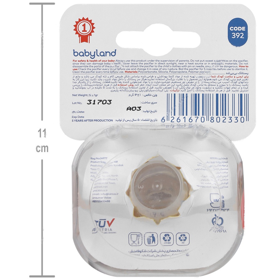 با خرید پستانک کودک ارتودنسی 392 از Baby land، میتوانید به راحتی و آرامش نوزاد خود کمک کنید. برای اطلاعات بیشتر به وبسایت مرجع babylandco.com مراجعه کنید. این محصول با کد بهداشتی 50/19698 در کشور ایران ساخته شده است.