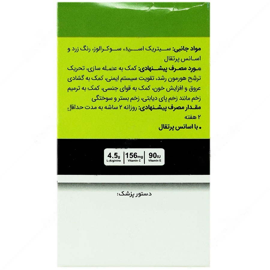 - حاوی 4.5 گرم ال آرژنین در هر ساشه برای بهبود عملکرد ورزشی.
