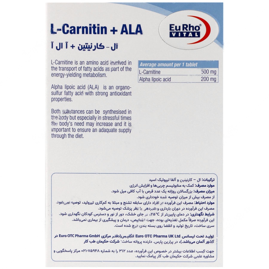 قرص ال کارنیتین و آ ال آ یوروویتال، محصولی منحصر به فرد و تحت لیسانس شرکت Euro OTC Pharma GmbH کشور آلمان، با پروانه ساخت شرکت حکیمان طب کار در ایران تولید میشود. هر قرص حاوی 500 میلی گرم ال-کارنیتین و 200 میلی گرم آلفا لیپوئیک اسید است که به افزایش سطح انرژی و کمک به چربیسوزی برای تولید انرژی ضروری در فعالیتهای ورزشی کمک میکند. این محصول در بستهبندیهای 60 عددی و به فرم دارویی قرص ارائه شده است.
