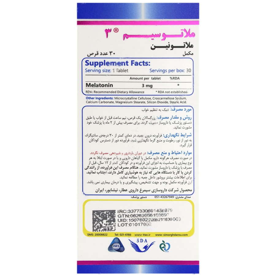 ملاتوسیم 3، یک مکمل تغذیهای از برند simorgh darou Attar است که حاوی 3 میلی گرم ملاتونین در هر قرص میباشد. این محصول بهویژه برای تنظیم خواب و کاهش اختلالات خواب طراحی شده است و مناسب برای افراد بالای 12 سال است. ملاتوسیم 3 در بستهبندی 30 عددی ارائه شده و تحت نظارت شرکت داروسازی سیمرغ داروی عطار تولید میشود.