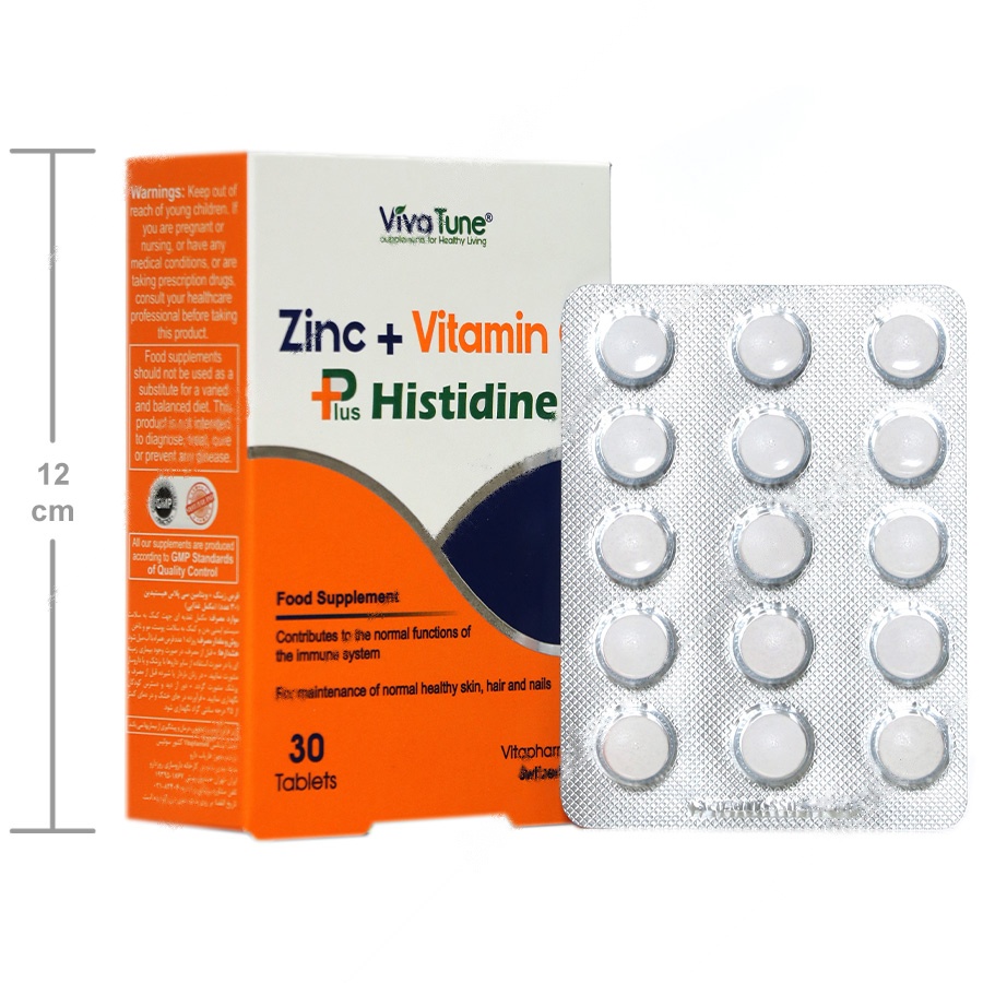 زینک پلاس ویتامین ث پلاس هیستیدین از برند VivaTune، یک مکمل تغذیهای منحصر به فرد و مؤثر است که به تأمین نیازهای بدن به روی، ویتامین C و هیستیدین کمک میکند. این محصول تحت لیسانس سوئیس و توسط شرکت ویتافارمد تولید شده است و شامل 30 عدد قرص در بسته بندی مقوایی میباشد.