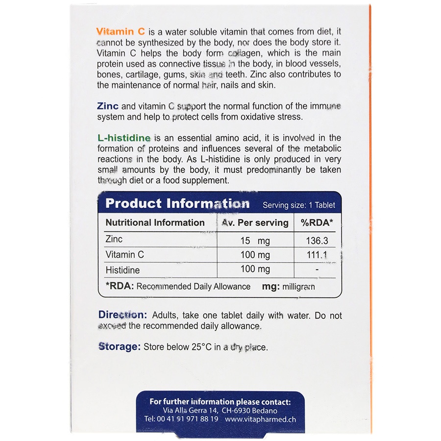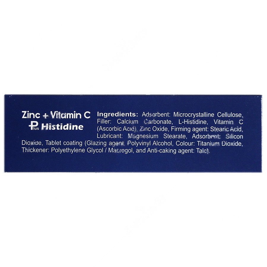 این مکمل حاوی 15 میلی گرم روی خالص به فرم اکسید است که برای متابولیسم سلولی و عملکرد سیستم ایمنی ضروری میباشد. همچنین ویتامین C موجود در این محصول به مقدار 100 میلی گرم، نقش مهمی در ساخت کلاژن و تقویت سیستم ایمنی ایفا میکند. هیستیدین نیز که به مقدار 100 میلی گرم در هر قرص موجود است، خاصیت آنتی اکسیدانی و ضد التهابی دارد و به تنظیم پاسخ ایمنی بدن کمک میکند.
